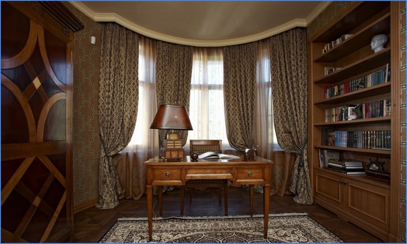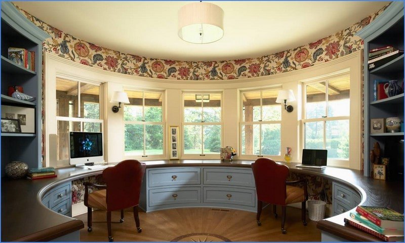Рабочий кабинет. Если эркерное остекление не доходит до пола, в нише устраивают рабочий кабинет, установив по всей ее длине подоконник и используя его в качестве рабочего стола. Красивый панорамный пейзаж за окном будет способствовать эмоциональной разрядке и снятию напряжения, чтобы избежать отвлекающей обстановки в комнате, устанавливают раздвижные ширмы, вешают шторы или делают легкую перегородку с дверями. От раздражающего воздействия солнечных лучей, отвлекающих от работы, защищаются любым видом жалюзи, рулонными или римскими шторами.