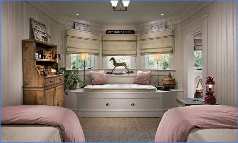 Детская комната. В эркерной зоне размещают площадку для игр детей, постелив на пол зала мягкий ковер и установив ящик для хранения игрушек. В нише отличная освещенность, поэтому для школьников ставят обычный или компьютерный стол, за которым они делают уроки.