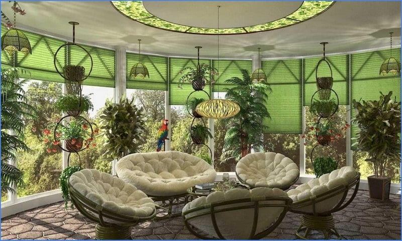 Гостиная. Один из популярных вариантов, имеет стандартное исполнение, когда по периметру рамы остекления располагают диван полукруглой формы, а перед ним в центре помещают журнальный столик. Нередко оформление интерьера дополняют кресла, комнатные напольные растения, фальш-колонны, проход к окнам загораживают мебелью или делает его свободным, отодвигая диван от оконной рамы. Для окон берут легкие прозрачные шторы, для защиты от солнечного излучения используют плотные портьеры.